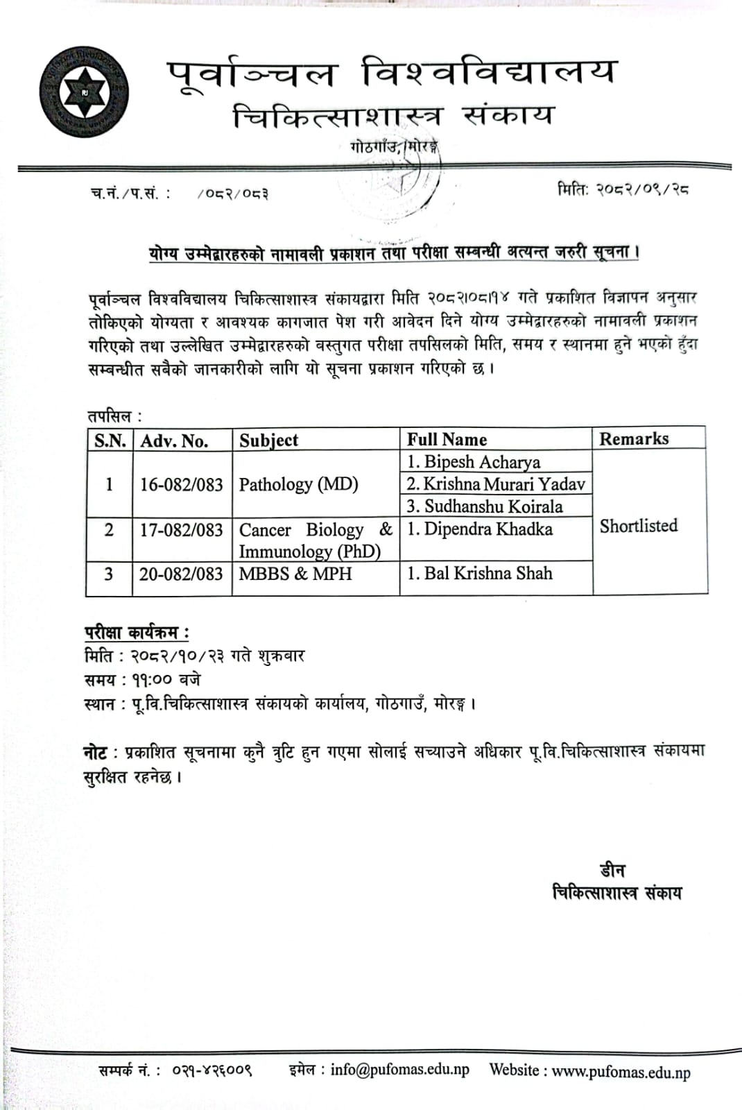 Faculty of Medical Sciencesयोग्य उम्मेद्वारहरुको नामावली प्रकाशन तथा परीक्षा सम्बन्धी अत्यन्त जरुरी सूचना