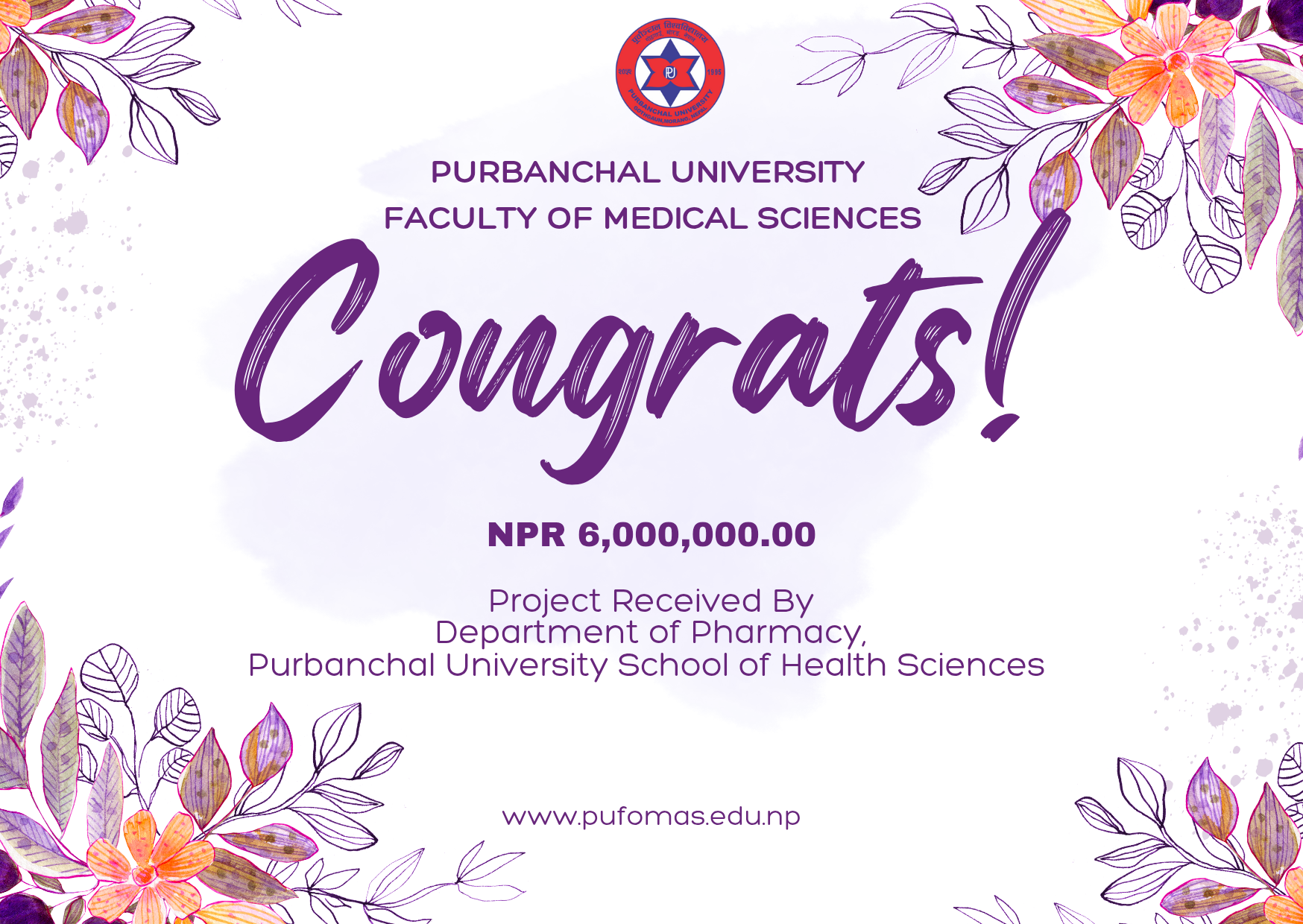 Faculty of Medical SciencesPurbanchal University Faculty of Medical Sciences (PUFOMS) is proud to announce that the Department of Pharmacy, Purbanchal University School of Health Sciences (PUSHS) has been awarded a significant research grant of NPR 6,000,000 (Six Million Nepalese Rupees) from the University Grants Commission (UGC), Nepal, on 2082 Ashadh 24 (July 8, 2025).