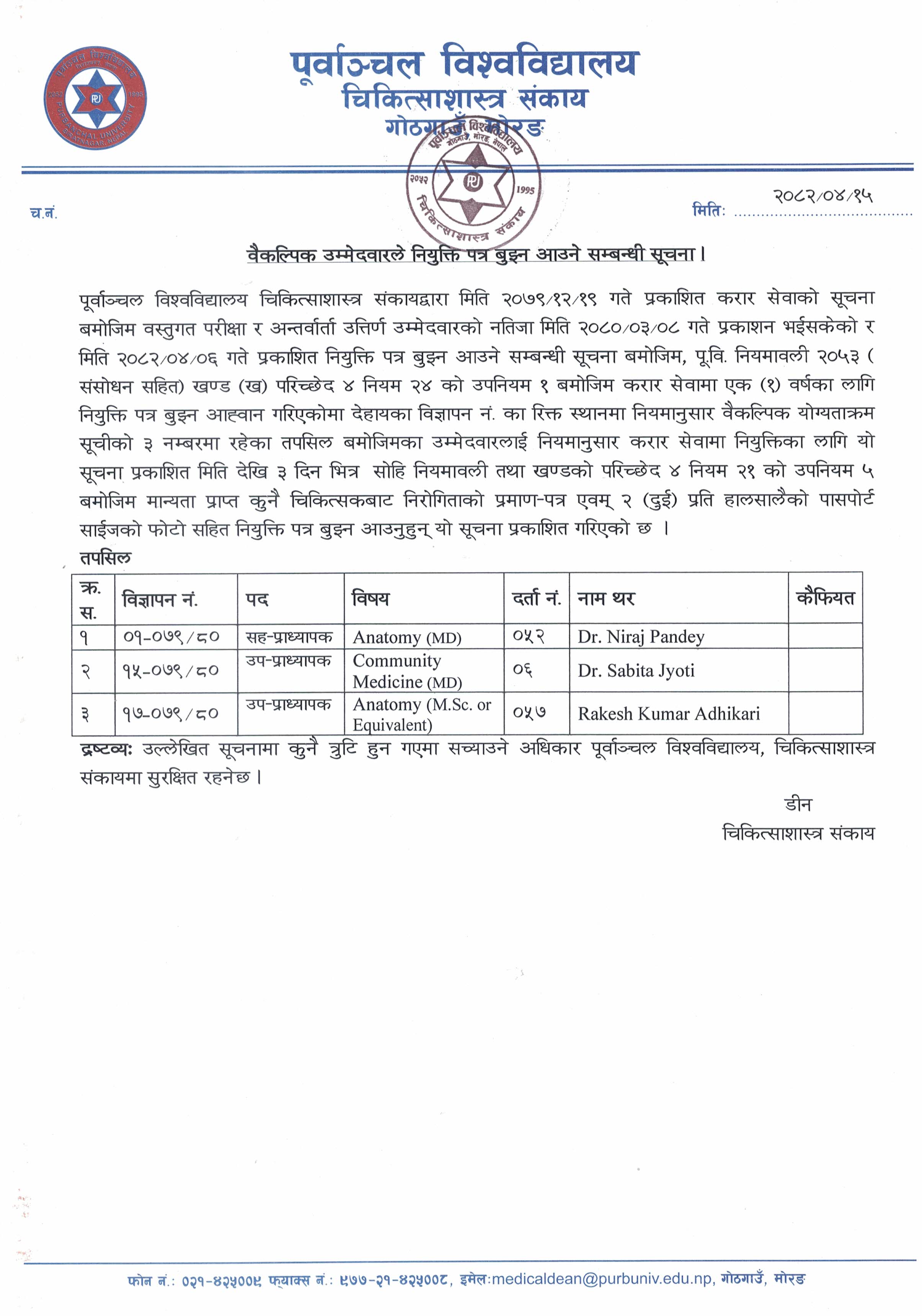 Faculty of Medical Sciencesवैकल्पिक उम्मेदवारले नियुक्ति पत्र बुझ्न आउने सम्बन्धी सूचना ।